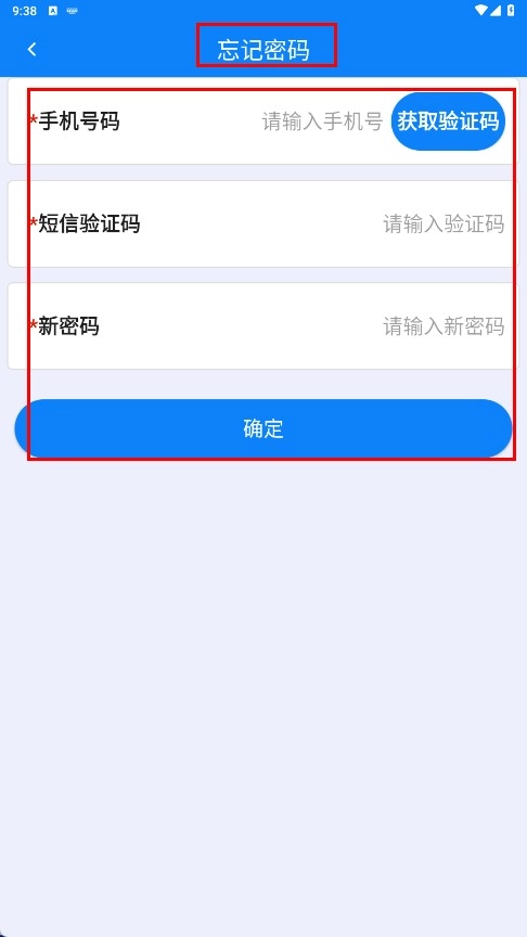4、忘记密码时,输入手机号,获取验证码,填验证码、新密码,点确定重置密码。