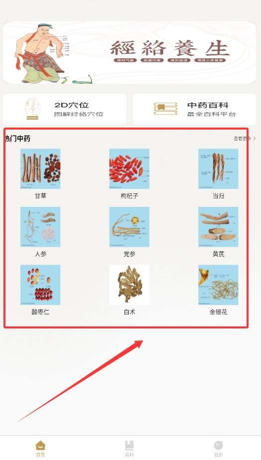 打开软件后,主界面上清晰展示着“2D穴位”“中药百科”等核心功能模块,点击即可开启探索。