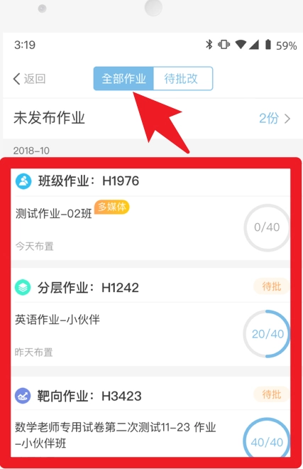 4、在作业管理模块中,教师能够查看所有已布置的作业,并且可以对班级作业、分层作业以及靶向作业进行批改和统计。