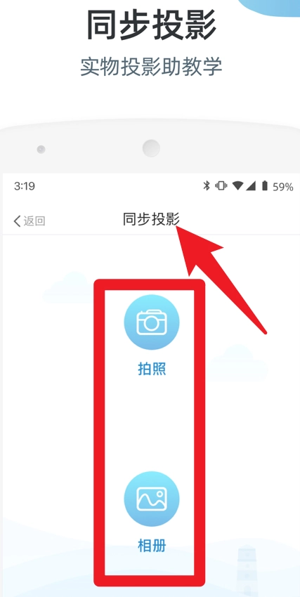 5、在首页选择同步投影功能后,用户能够通过拍照或者从相册里挑选图片,借助实物投影来辅助教学,使课堂展示变得更直观。
