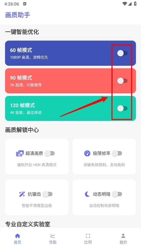 3、依据个人需求开启对应帧率的开关,如图所示,系统便会自动进行优化。