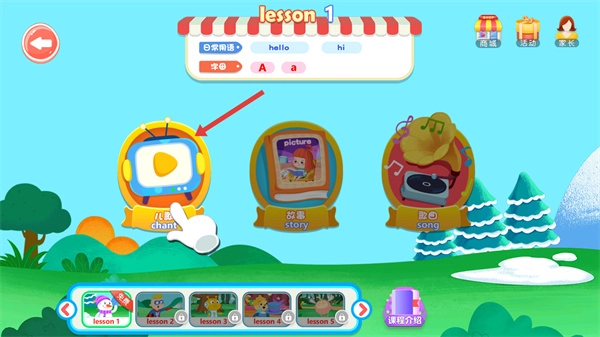 进入【日常口语课】的【lesson-1】页面后,点击【儿歌-chant】入口即可开始学习,该页面同时还显示有【日常用语】等内容标识。