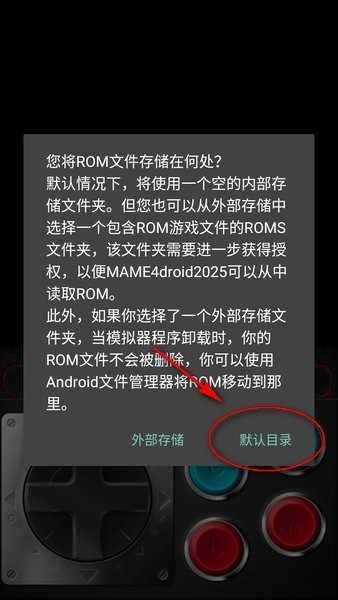 启动MAME4droid应用后,系统会弹出“您将ROM文件存储在何处?”的询问提示,此时选择点击“默认目录”选项即可。