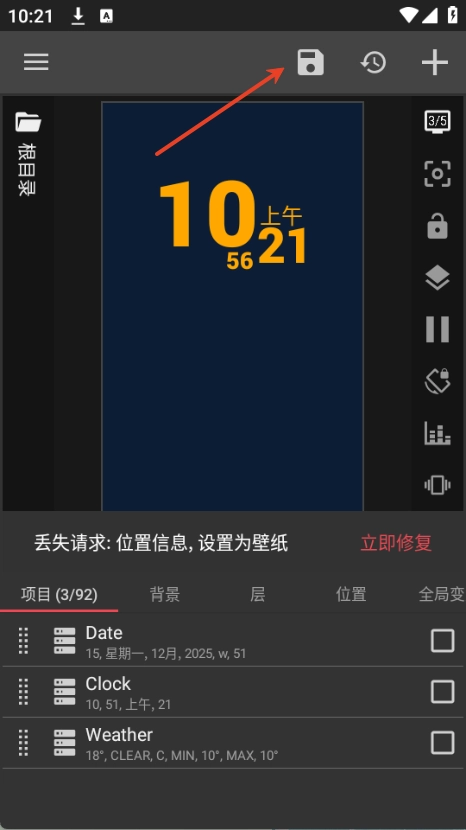 按需添加天气、电量等组件,设置好触摸交互后,点击右上角的“保存”按钮即可完成操作。