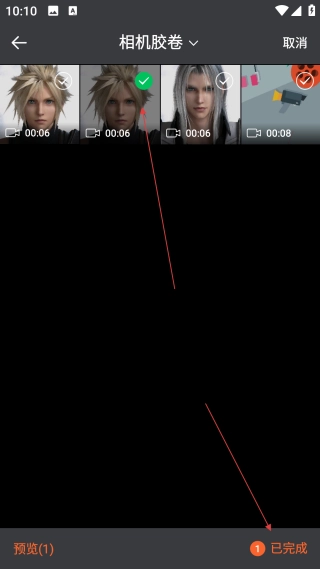 在相机胶卷页面,勾选【目标视频】后点击【已完成】按钮,即可进入视频剪辑界面。