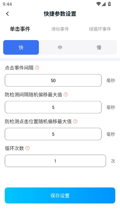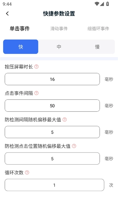 3、可实时对手机点击频率、手指按下时长、手指弹起时长(通常无需调整)等参数进行设置。