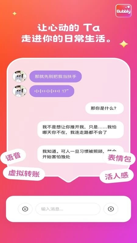 4、多场景应用,无论是日常闲聊、情感倾诉,还是娱乐互动,Bubbly都能完美适配。你可以把它当作树洞、恋人、挚友,在任何需要陪伴的时刻,它都会在你身边。