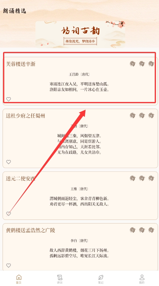 4、若想查找某一首特定的诗,只需在搜索框中输入对应的诗名,例如《芙蓉楼送辛渐》,即可快速定位到该作品。