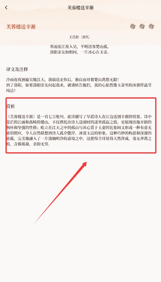 2、进入诗词页面后,向下滑动屏幕,就能看到对应的译文、注释以及赏析内容,这些可以帮助你更好地理解诗歌的含义与蕴含的情感。
