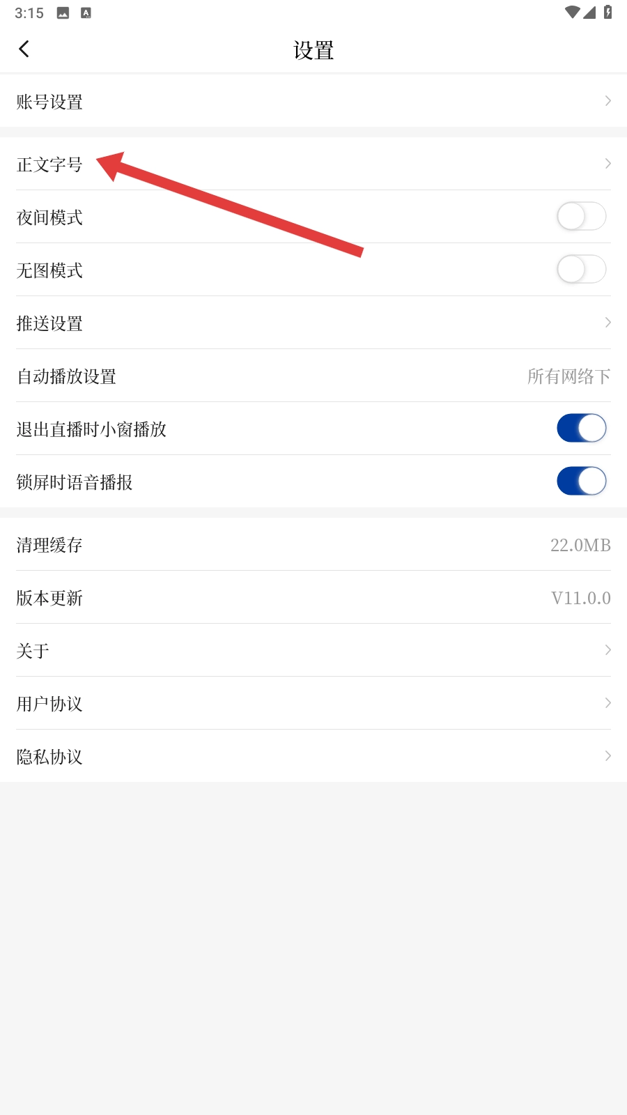 3、进入设置页面后,点击【正文字号】选项,就能进入字号调整界面了。