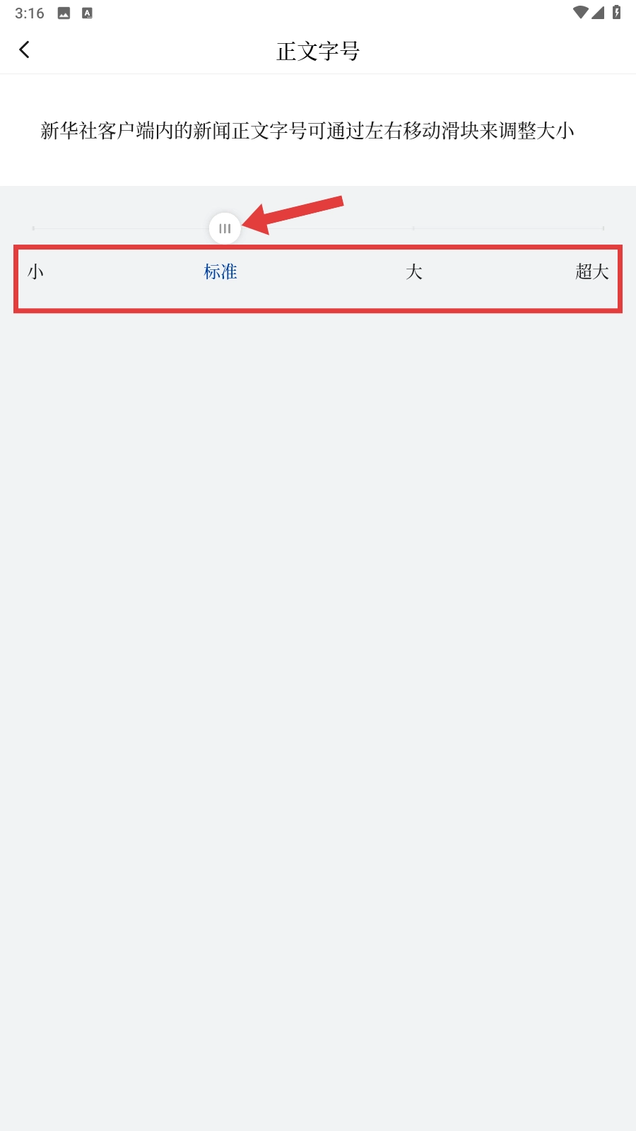 4、进入【正文字号】界面后,通过左右拖动滑块,就能在【小】、【标准】、【大】、【超大】这几个字号选项中进行选择,根据自己的需求调整就可以了。