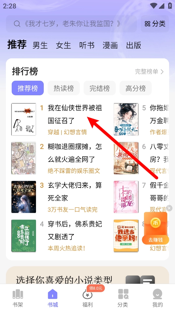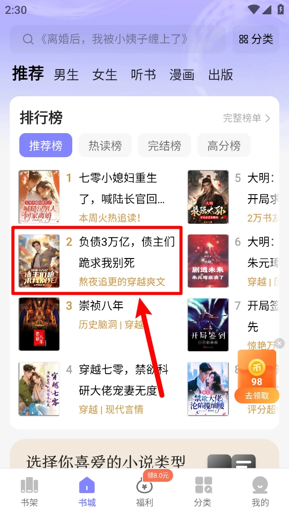 在书城中选择需要听书的小说资源。