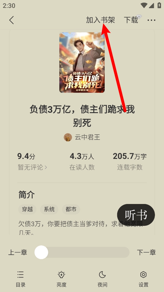 然后在阅读界面点击上方的"加入书架"。