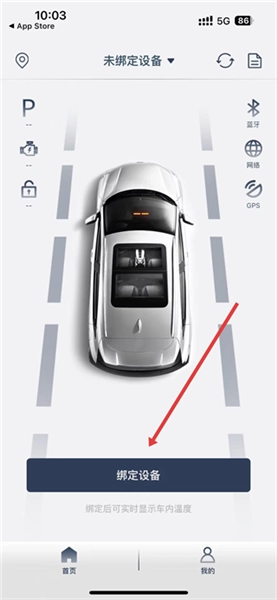 可查看车辆状态以及蓝牙、网络等功能,点击“绑定设备”选项即可完成车辆设备的绑定操作。