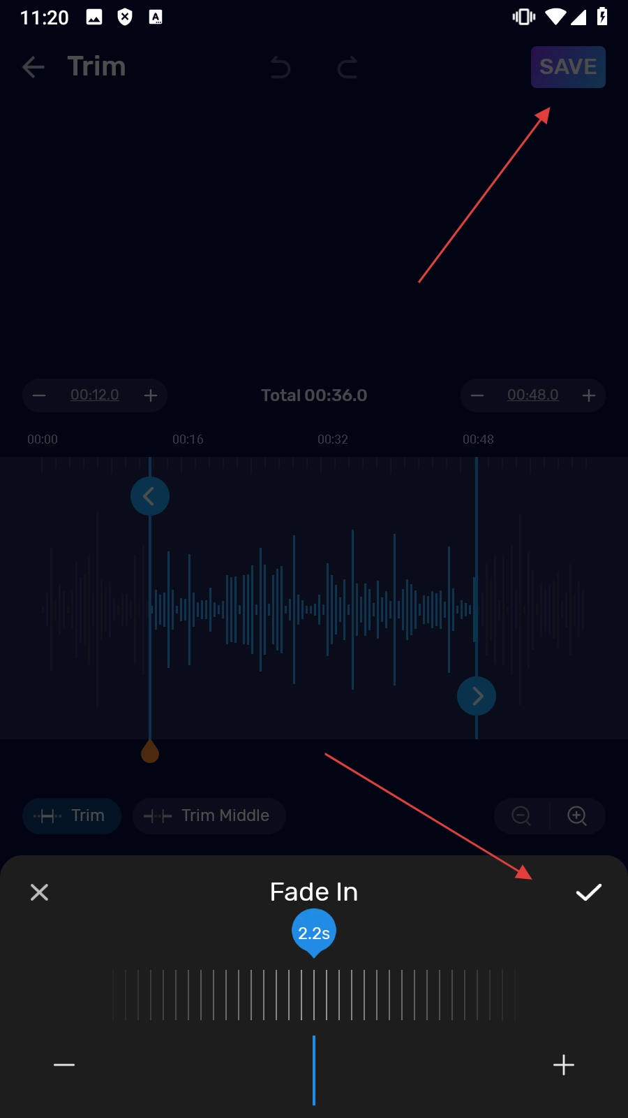 1、点击【修剪】,进入音频选择页面。