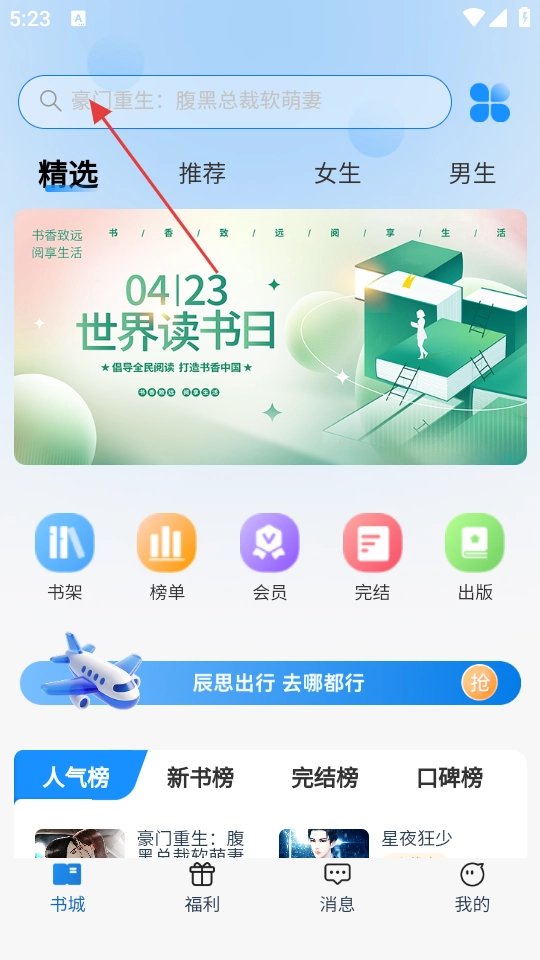 1、进入书城页面后,点击顶部的搜索框,输入你想阅读的书籍相关关键词,例如“重生”。