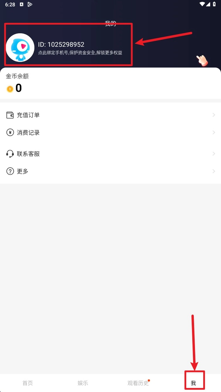 打开应用后,点击底部导航栏中的“我”,进入个人中心页面,即可查看用户ID和金币相关信息。