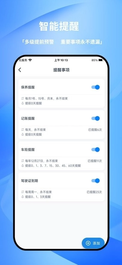 可自定义保养、车险等周期性提醒,支持多级提前预警,确保重要事项永不遗漏。