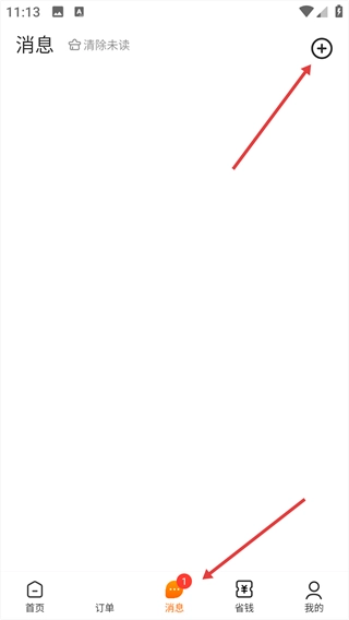 进入【消息】页面后,点击右上角的加号按钮,即可展开功能选项菜单。