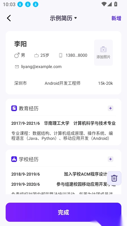 5、接着在“示例模版”里依次点击“新增”按钮与“+”号,输入个人简历信息后,点击“完成”即可生成专属简历。