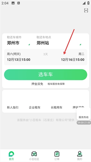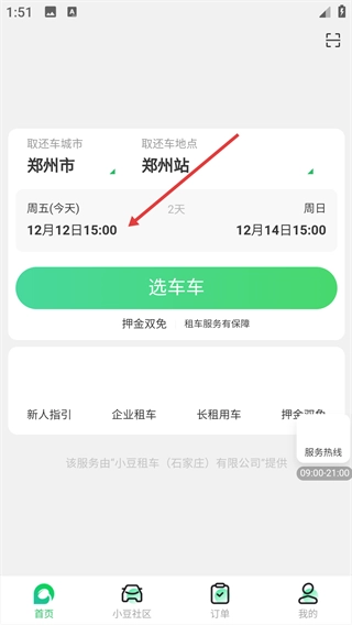 回到首页后,能看到取还车的时间已经更新成调整过后的时段了。