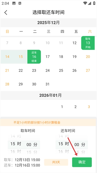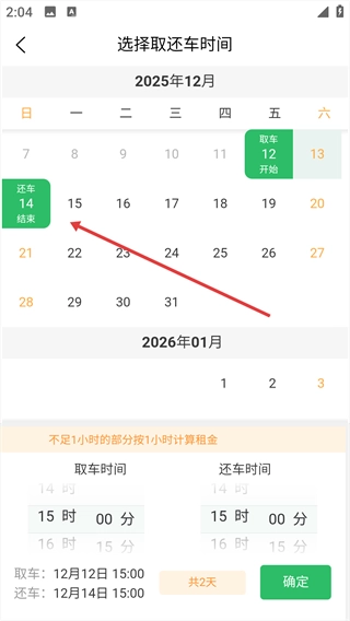 点击取还车时间的区域,即可进入【选择取还车时间】页面。