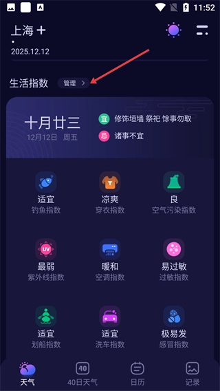 在天气页面里,找到【生活指数】旁边的【管理】按钮,然后点击它。