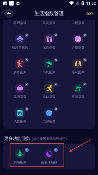 进入【生活指数管理】页面,在【更多功能服务】区域添加所需的指数。