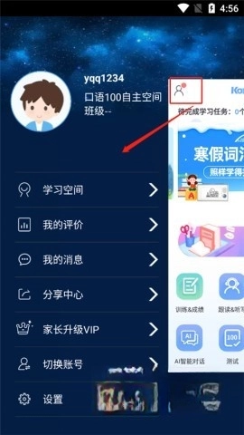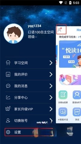 1、第一步是打开口语100学生端,接着点击界面左上角的小人形状图标,以此进入个人设置页面。