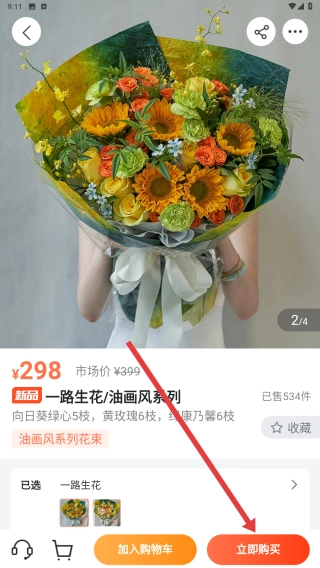 3、进入花束详情,确认信息后点【立即购买】,可先【加入购物车】再统一结算。