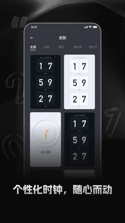 这是一款简约美观的时钟皮肤工具,你可以根据个人喜好自定义时钟的各类风格,调整背景颜色、字体样式以及文字大小等参数。作为一款能让你沉浸其中的极简主义翻页时钟应用,这款全新的时钟软件将为用户带来与众不同的使用体验。