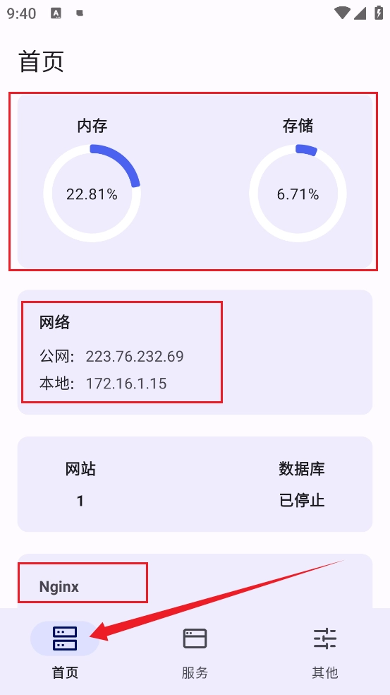 2、在这里可以查看手机内存与存储的使用状况、网络运行情况,以及Nginx等相关信息。