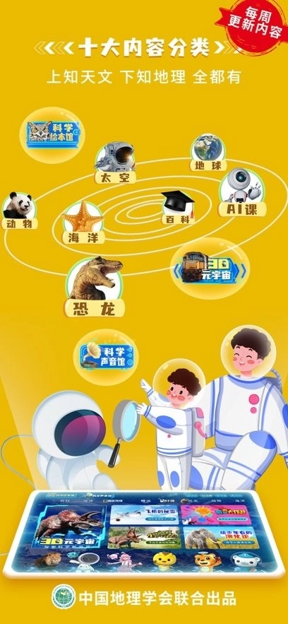 九大小朋友钟爱的儿童科普类别分类如下:百科、地球、国家地理、恐龙、动物、海洋、太空、AI互动答题课程以及AR视觉交互百科欢乐谷。