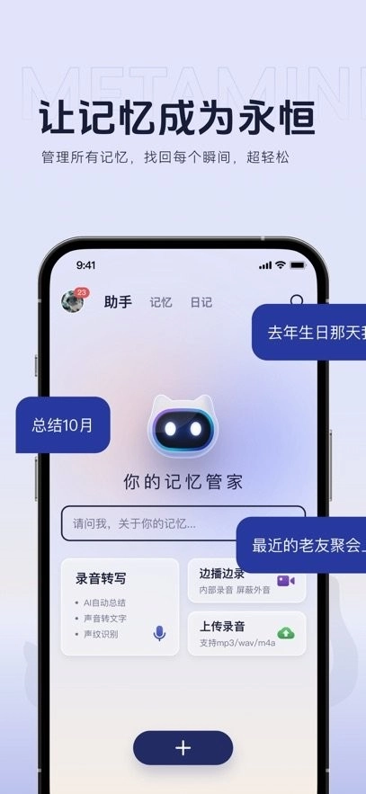 好记猫(metamind)是您全天候的记忆助手,无论是开会、学习还是灵感迸发的时刻,都能随时通过录音转写功能记录,并一键生成总结纪要,轻松留存您生活中的每一个重要瞬间。