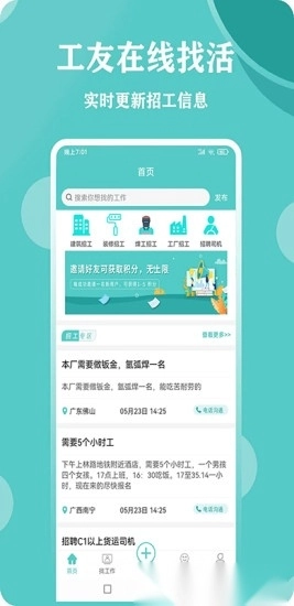 这是一个建筑工地招工找活的平台,汇聚了丰富全面的工作信息,工友们能便捷地在线浏览查看,了解各类工种服务。建筑从业者可根据自身工种发布相关信息,平台能快速匹配,助您找到合适的工友,同时还会优先展示附近工地的招工信息。