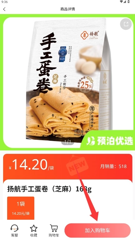 4、进入商品详情页面后,点击页面右下角的“加入购物车”按钮,就能将商品添加到购物车中。