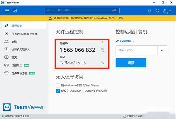 在电脑上启动TeamViewer应用程序,找到并记下其ID号码与对应的密码。