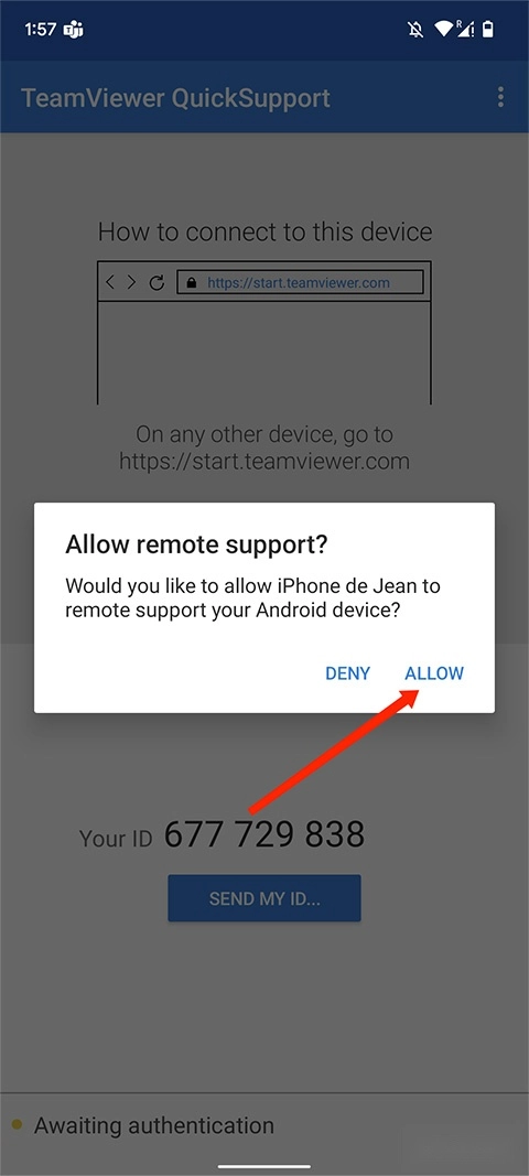 在被控制的手机端会弹出一个远程控制确认提示,此时选择“ALLOW/允许”选项即可。
