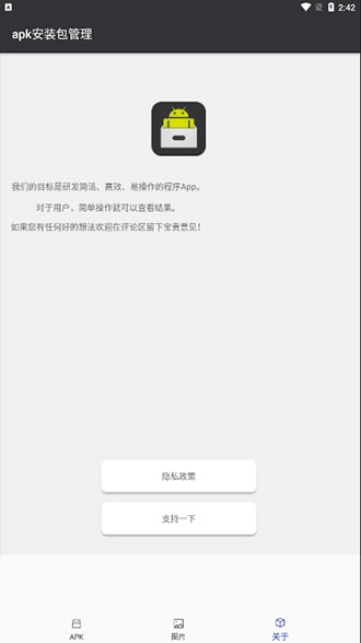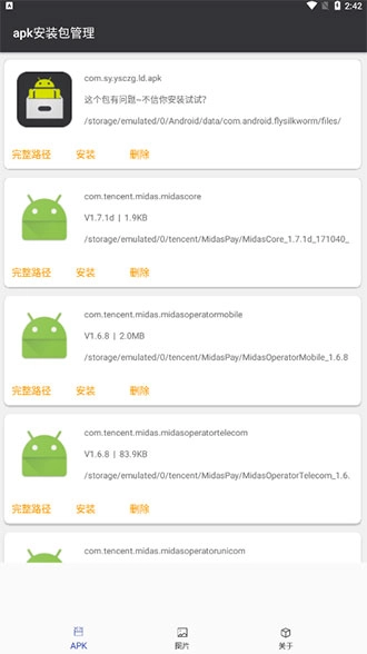 在本站完成软件的安装与运行后,您将看到APK、图片、关于三个功能板块。其中,APK板块可展示手机内所有安装包,您能在此自由查询安装路径,也可对安装包进行安装或删除操作。