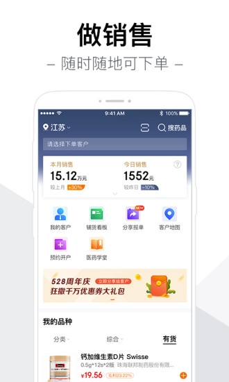 这是一款专为医药行业定制的移动销售辅助工具,支持随时随地在线提交订单,可实时追踪订单状态,全程掌握药品品种的流向动态,还能即时查看每位员工的近期销售业绩情况,期待您的使用。