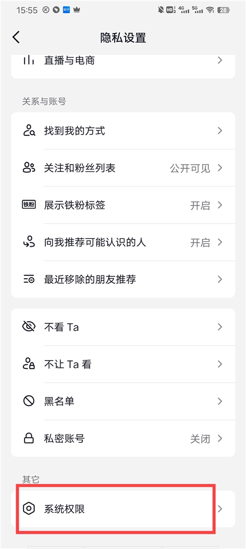 进入隐私设置后,一直向下滑动页面,直到最后找到并点击系统权限选项。