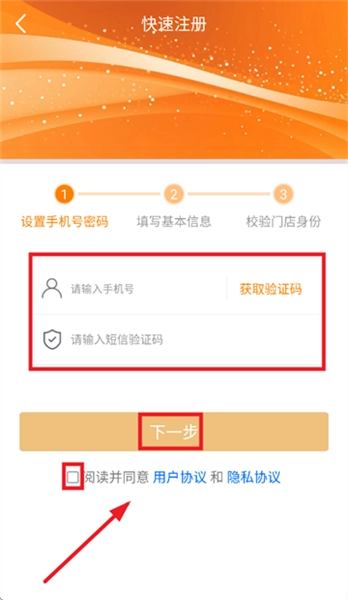 在快速注册页面填写手机号与验证码,勾选同意用户协议及隐私协议后点击下一步,接着完善基本信息并完成门店身份校验,即可完成注册流程。