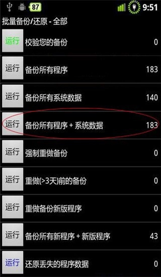 完成上一步操作后,就会进入图六所示的界面。钛备份会自动识别并找到备份程序,接着上推菜单,找到红圈标注的“还原所有的程序和数据”选项,然后点击其左侧的“运行”按钮即可。