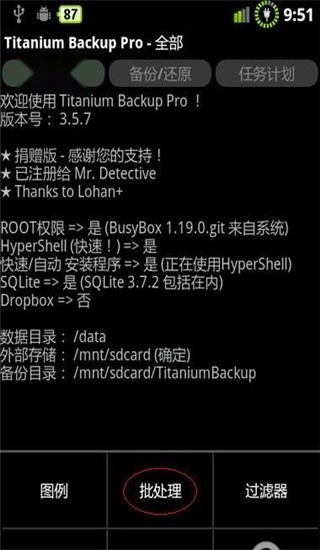 打开钛备份,先点击手机左下角的“菜单键”,接着再点击“批处理”选项(这和备份时的前两个步骤是一样的)