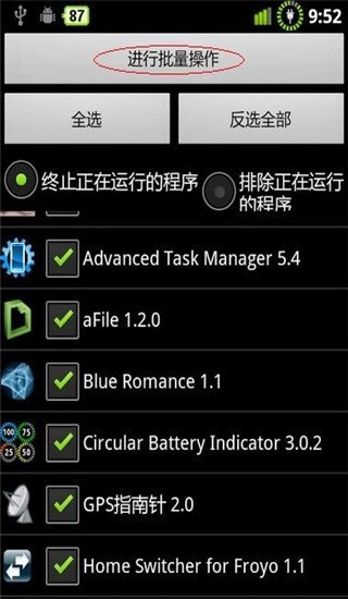 点击手机左下角的“菜单键”,即可进入图二界面。随后,点击红圈标注的“批处理”选项。