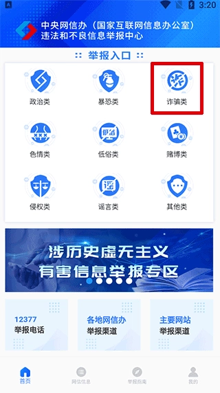 打开网络举报平台后,在首页的选项栏里找到并点击您需要举报的类型对应的按钮,这里以诈骗类举报为例。