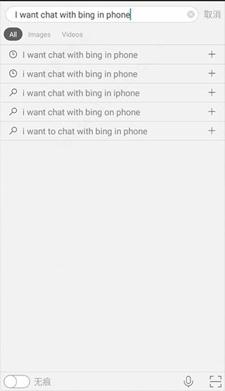 接着在搜索框里输入“ I want chat with bing in phone”,要留意在手机上输入别的文字是无法唤出AI对话机器人的,只能开展简单的搜索操作。