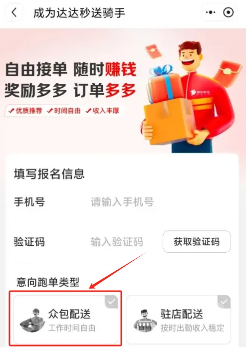 京东外卖的众包骑手被称为达达秒送骑士,这意味着京东外卖的众包配送是通过达达秒送骑士软件来开展的,属于一种颇具创新性的配送服务模式。大家在申请成为骑手时,只需在选择意向跑单类型时留意勾选众包配送选项就可以了。众包配送的一大优势在于工作时间相对更为灵活自由。