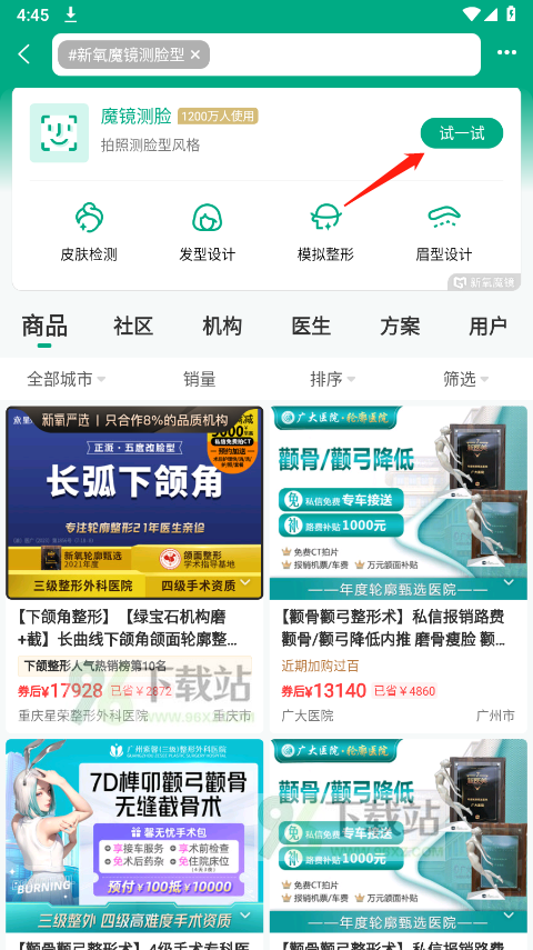 3、搜到之后,你会看到一个“魔镜测脸”,旁边有个“试一试”,你就点它。