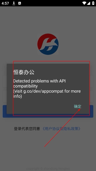 1、当【恒泰办公】弹出【Detected-problems-with-API-compatibility】的提示时,请点击【确定】按钮关闭该弹窗,这样才能继续进行后续的操作步骤。